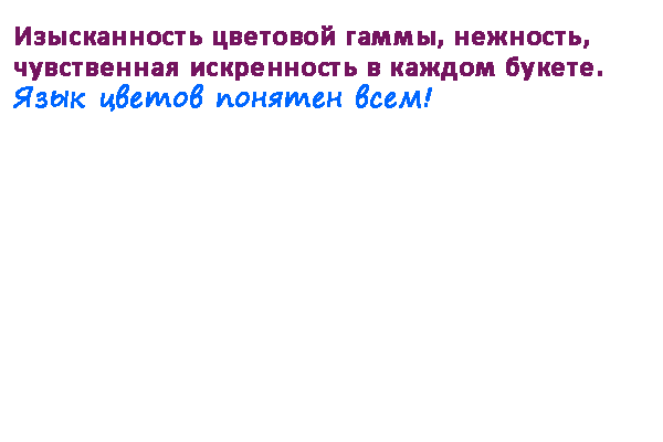 Профессиональные флористы и собственная служба доставки обеспечивают надлежащее качество и оперативность исполнения заказов с учетом любых требований заказчика. Прямые контакты с поставщиками гарантируют наличие большого ассортимента свежих роз и других позиций цветов в любое время года.